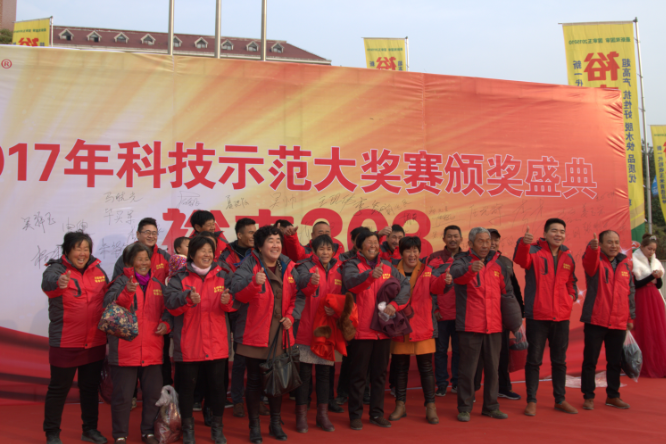 現(xiàn)場(chǎng)針對(duì)2017年221名裕豐303優(yōu)秀種植示范戶分別頒發(fā)十萬(wàn)轎車、金磚、電動(dòng)三輪車獎(jiǎng)品,以表彰他們科學(xué)種田、示范推廣優(yōu)良品種裕豐303所作出的突出貢獻(xiàn)。其中一等大獎(jiǎng)價(jià)值十萬(wàn)元的轎車被安徽蕭縣酒店鎮(zhèn)胡孝蘭摘得,其中參賽產(chǎn)量為2252.9斤;二等獎(jiǎng)價(jià)值5000元的金磚分別被河南省西華縣、滑縣、山東省梁山縣、陽(yáng)信縣、河北省臨漳縣、任丘市、安徽利辛縣、泗縣、江蘇灌云到等20個(gè)縣市示范戶獲得,其中山東省平度市張舍鎮(zhèn)石賢勝畝產(chǎn)達(dá)2108斤、滕州市張汪鎮(zhèn)張佑代畝產(chǎn)達(dá)2025.36斤、河北省灤平縣大屯鄉(xiāng)王國(guó)強(qiáng)畝產(chǎn)達(dá)2040.28斤;二等獎(jiǎng)20名平均畝產(chǎn)達(dá)1800以上。